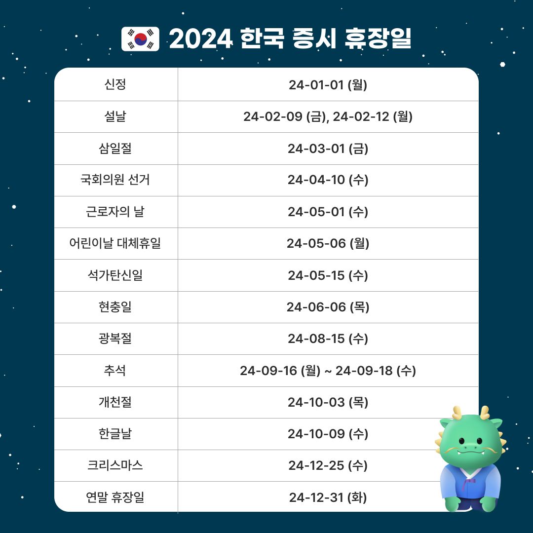 한국 증시도 여러 가지 휴장일이 있으니, 함께 살펴보면 좋겠어요. 2024년의 휴장일을 정리해보았어요.