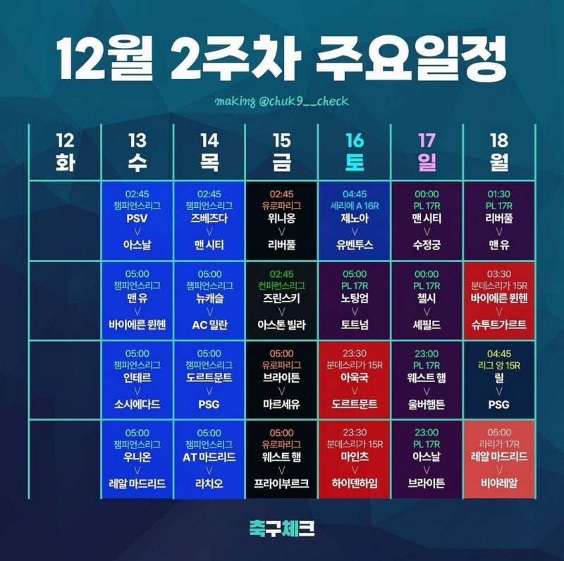 12월은 축구 팬들에게 정말 흥미로운 달이에요. 다양한 리그에서 많은 경기가 열리기 때문인데요. 특히 12월 12일부터 18일까지의 일정은 많은 팀들이 중요한 경기를 치르게 됩니다. 이 기간 동안 PSV, 아스날, 맨체스터 시티, 리버풀 등 유명 팀들이 출전하는 경기가 예정되어 있어요.