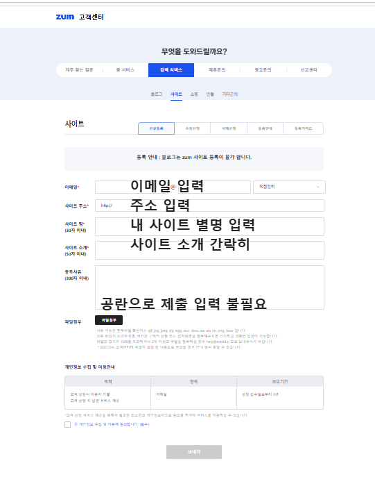 저 같은 경우는 사이트 소개란에 그냥 인터넷 정보 및 리뷰라고 적어뒀습니다. 그리고 다른 칸들은 공란으로 두셔도 됩니다. 첨부파일 제출도 필요없습니다.