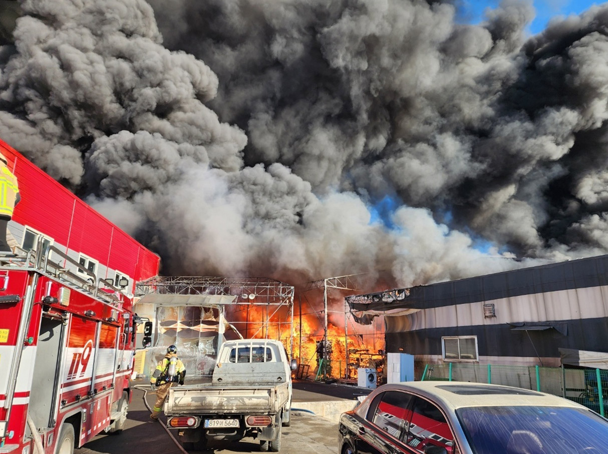 에서 보듯이, 화재가 발생한 공장은 두꺼운 검은 연기로 가득 차 있었고, 소방차들이 긴급히 출동하여 화재 진압에 나섰습니다. 초기 진화 작업이 어려운 상황이었지만, 소방대원들은 최선을 다해 불길을 잡으려 했습니다.