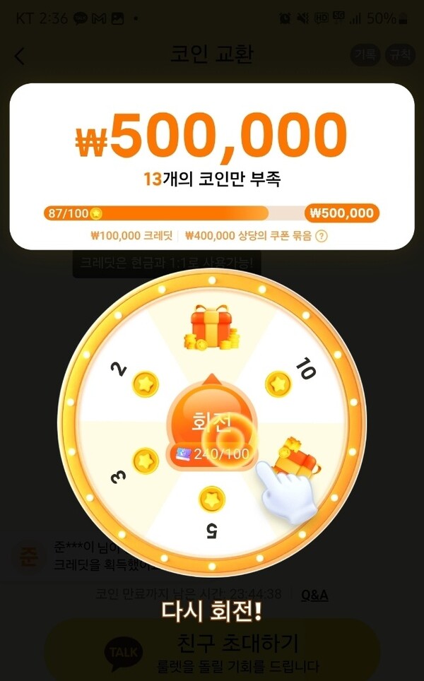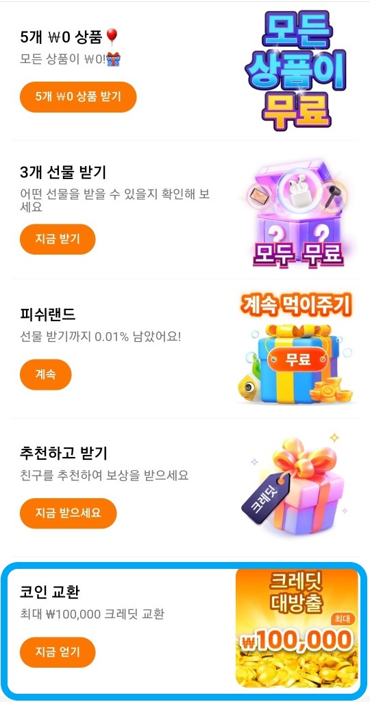 이 이미지는 제가 받은 보상과 함께 진행 중인 코인 교환 이벤트를 보여주고 있어요. 정말 재미있고, 친구를 초대하면 추가 보상도 받을 수 있어서 좋더라고요!