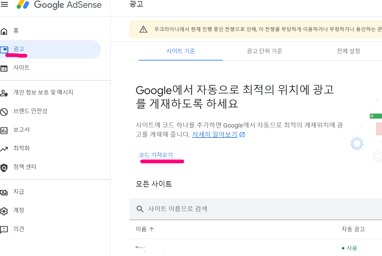 이제 에드센스 홈에서 광고를 눌러 코드가져오기 버튼을 눌러 줍니다. 그러면 복사할 수 있는 코드 링크가 떠요!